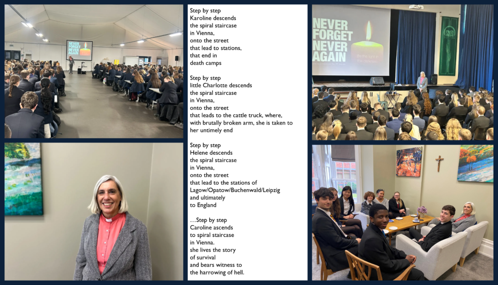 We welcomed Rev Canon Caroline Dick from St Cuthbert’s Church of England parish to lead our reflections and prayers in the week that marked the 80th anniversary of the liberation of Auschwitz. We cannot fathom the depth of suffering for so many millions of Jewish and other victims of the Holocaust, but we can start to glimpse the scale of the horror through the testimony of one family. Caroline shared her family story, of her mother, Helene, who escaped the selection process in a Nazi concentration camp at the age of 14, of her aunt, Lottie, who perished at the age of 7, and of her grandmother, Karoline, who was also murdered.
