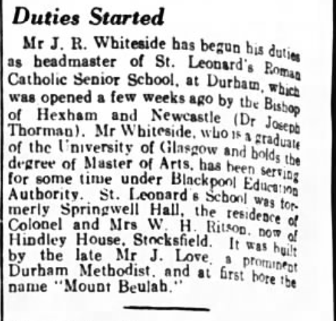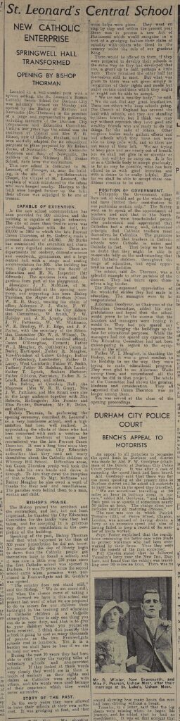 Springwell Hall was purchased by the Diocese of Hexham and Newcastle in 1935 at a cost of £8,000. Canon Robert Thornton, long-time parish priest of St Godric’s, was instrumental in acquiring the site, and personally paid £4,000 towards the cost of the school. On 26th August 1936, Springwell Hall became the home to St Leonard’s Catholic Central School.