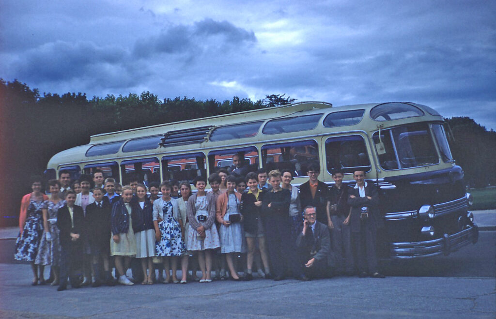 The photo below shows a school trip to Lourdes in 1960. The Headteacher, Mr Mukerrin, is the one crouching lower right. The trip went by coach to Southend, then flew (in a chartered Dakota) to Paris Le Bourget, spent a day or two sightseeing in Paris (where the photo was taken), then took the train to Lourdes.